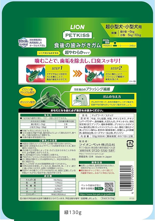 原材料:牛皮、でん粉類、米粉、チキンエキス、チキンレバーパウダー、食物繊維、、大豆たん白、チキンオイル、増粘安定剤(加工デンプン、増粘多糖類)、グリセリン、カゼインNa,酸化防止剤(ミックストコフェロール)、微粒二酸化ケイ素、ピロリン酸Na、着色料(銅葉緑素)、炭酸Ca、pH調整剤、緑茶抽出物、ローズマリー抽出物、ポリリジン