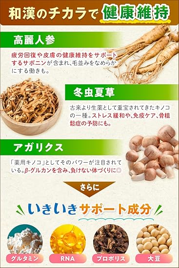 漢方として用いられ 疲労回復 や 皮膚 の 健康維持 をサポートする 高麗人参 、古来より生薬として重宝されてきた 冬虫夏草 、「薬用キノコ」ともいわれる アガリクス 、胃腸の保護や 筋肉 づくりに役立つ グルタミン 、疲れ