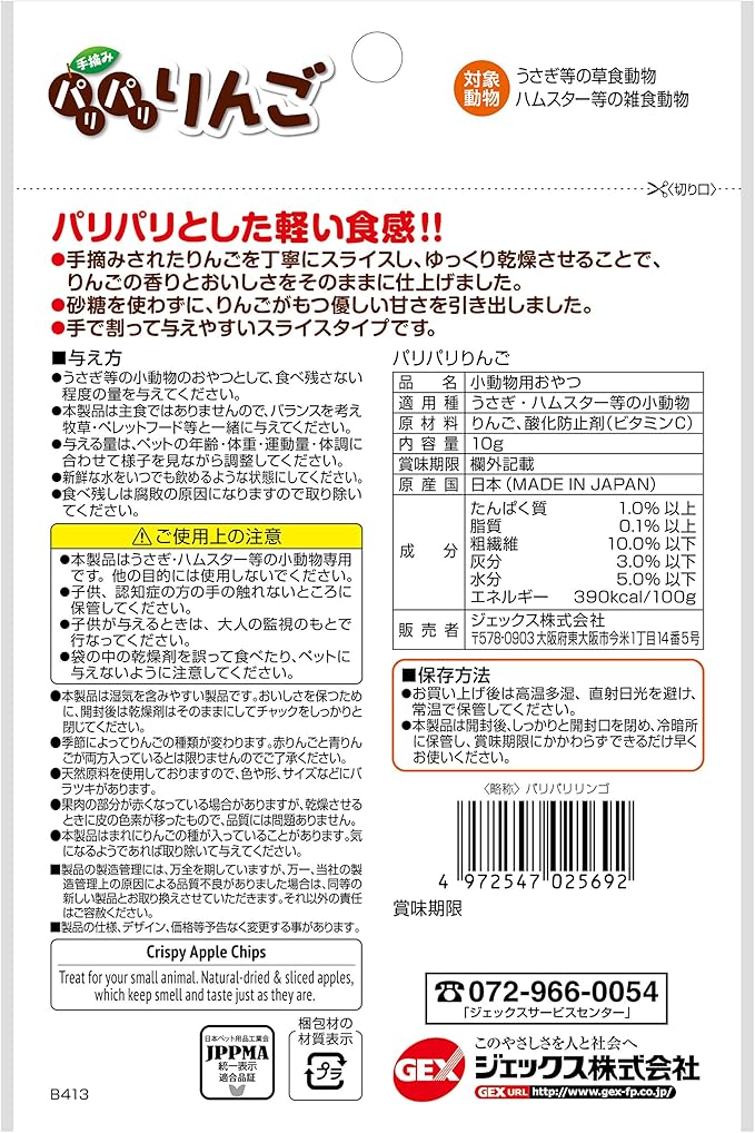 国産のりんごを薄くスライスして自然に乾燥させた、パリパリとした食感のりんごです割って与えやすく、歯の負担にならないほど良い硬さが歯の伸びすぎ防止とカロリー消費に役立ちます。