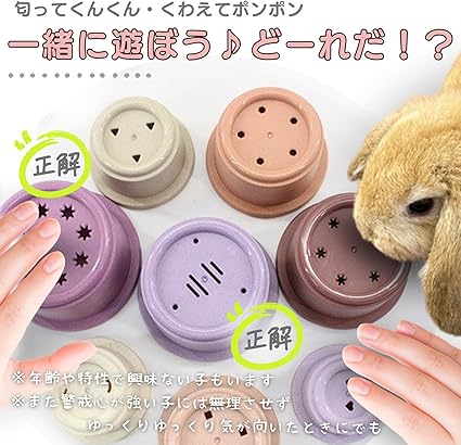 【楽しく遊んでおやつをGET!】カップの中におやつを入れて、兎さんが咥えてカップを外すことで大好きなおやつを見つけることができます。遊ぶ楽しさ、見つける喜び、ぽんぽんモグモグと、とても可愛いです♪