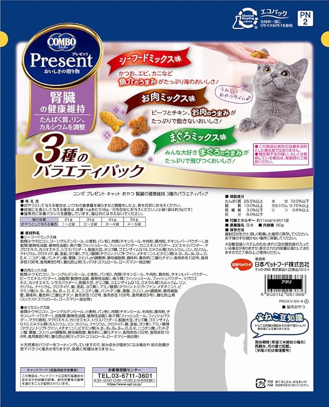 コンボ プレゼント キャット おやつ 3種のバラエティパック 腎臓の健康維持 90g 【かりかりドライ】 【国産】 【小分包装】 a