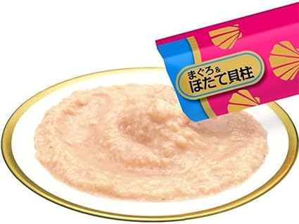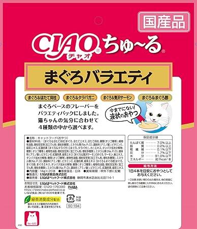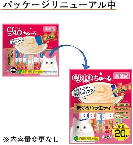 4種類の味(まぐろ&ほたて貝柱、まぐろ&タラバガニ、まぐろ&まぐろ節、まぐろ&贅沢サーモン)が楽しめる液状の猫用おやつです。緑茶消臭成分配合で、腸管内の内容物の臭いを吸着し、糞尿臭を和らげま