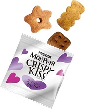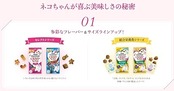 白身魚、チキン、米、チキンミール、牛脂、えんどう豆でんぷん、コーングルテン、大麦、たんぱく加水分解物、酵母、キャッサバ粉、モルトエキス、ぶどう糖、サーモンパウダー、えびパウダー、ミネラル類(カルシウム、カリウム、ナトリウム、クロライド、鉄、銅、マンガン、亜鉛、ヨウ素、セレン)、酸味料、アミノ酸類(グリシン、タウリン)、ビタミン類(A、D、E、K、B1、B2、パントテン酸、ナイアシン、B6、葉酸、ビオチン、B12、コリン、C)、着色料(食用赤色40号、食用青色2号、食用黄色4号、食用黄色5号)、酸