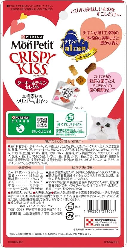 チキン、チキンミール、米、牛脂、えんどう豆でんぷん、大麦、コーングルテン、たんぱく加水分解物、酵母、キャッサバ粉、ターキーミール、モルトエキス、ぶどう糖、ミネラル類(カルシウム、カリウム、ナトリウム、クロライド、鉄、銅、マンガン、亜鉛、ヨウ素、セレン)、酸味料、アミノ酸類(グリシン、タウリン)、ビタミン類(A、D、E、K、B1、B2、パントテン酸、ナイアシン、B6、葉酸、ビオチン、B12、コリン、C)、着色料(食用赤色40号、食用青色2号、食用黄色4号、食用黄色5号)、酸化防止剤(ブチルヒドロキ