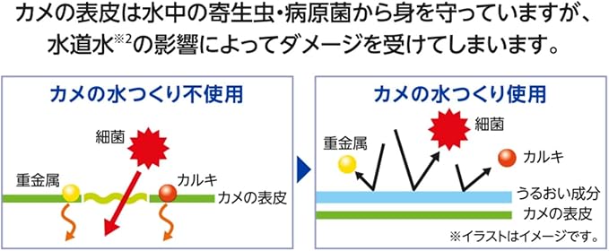 カルキ抜き+うるおい成分で、水道水からカメの繊細な表皮を守ります。