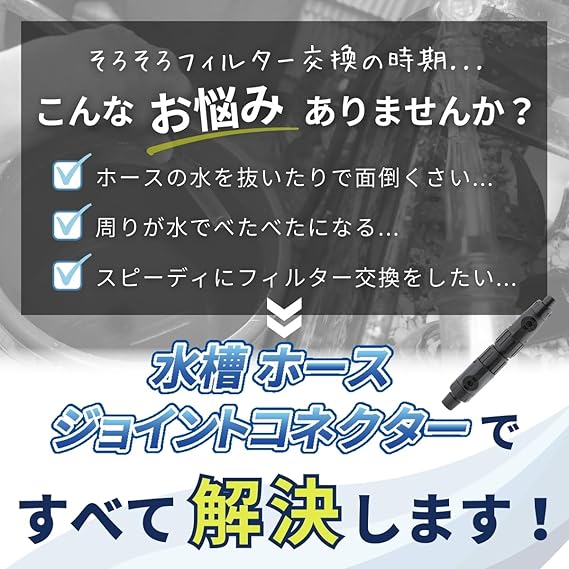 高品質で安心の水漏れ防止機能: 「精密に設計されたダブルタップコネクターは、すべての接続点において高い水密性を確保。外部フィルターの取り外し時も水漏れの心配が少なく、長期間にわたって安心してご使用いただけます。特に水槽の清掃や水替えの際にその効果を発揮します。」