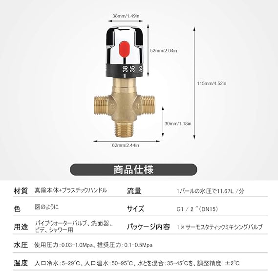 【サーモスタット混合弁の温度調節】冷水温度:5〜29℃、給湯温度:50〜95℃、混合水:35〜45℃、調整精度:±2℃ G1 / 2 "サイズなので、簡単に取り付けます。バルブのサーモスタットは38℃に設定しております。