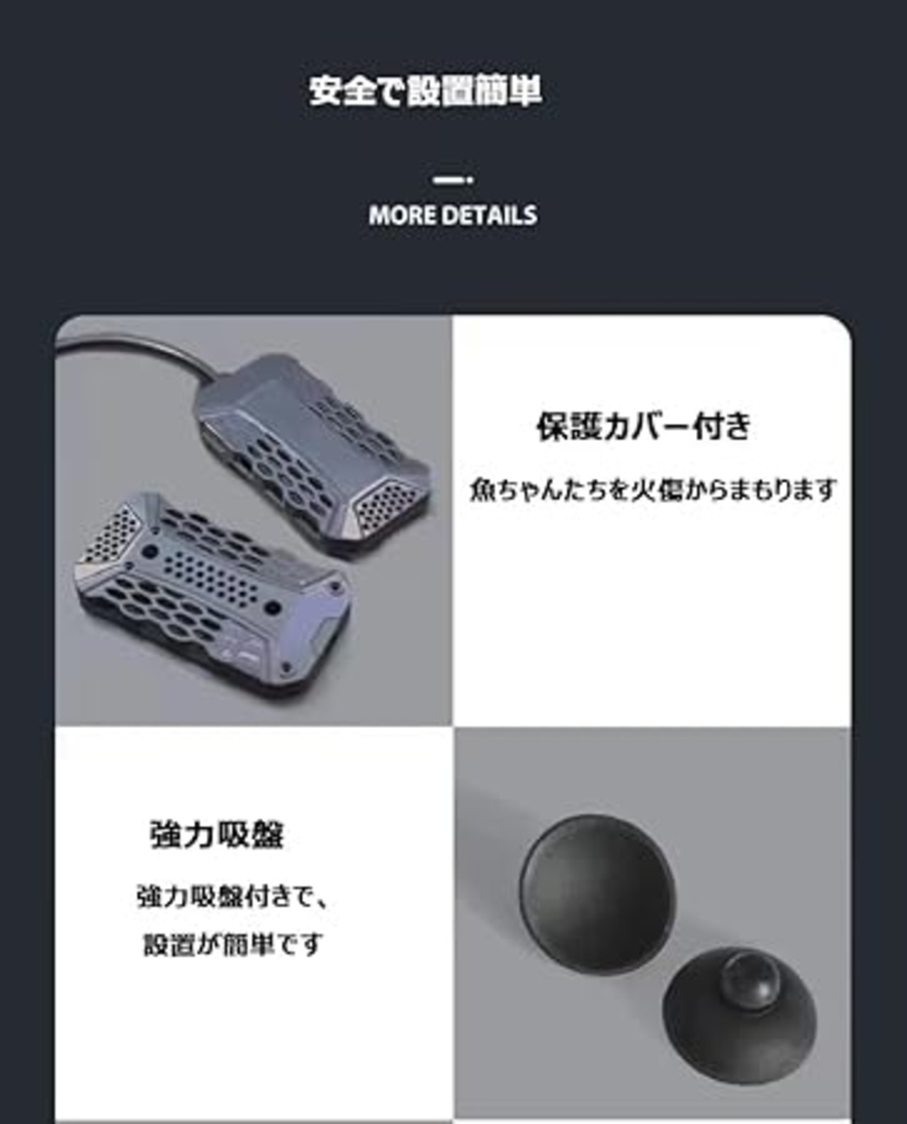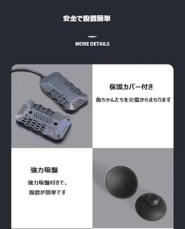 サーモスタット付き機能 水槽用ヒーター:サーモスタットは水槽の温度を感知して、水温が低ければヒーターをON、高ければOFFにする働きがあります。ご設定された温度で温度管理しながら、加熱します。水温計は、ヒーターから離れた位置に設置しましょう(正確に温度をはかれます)