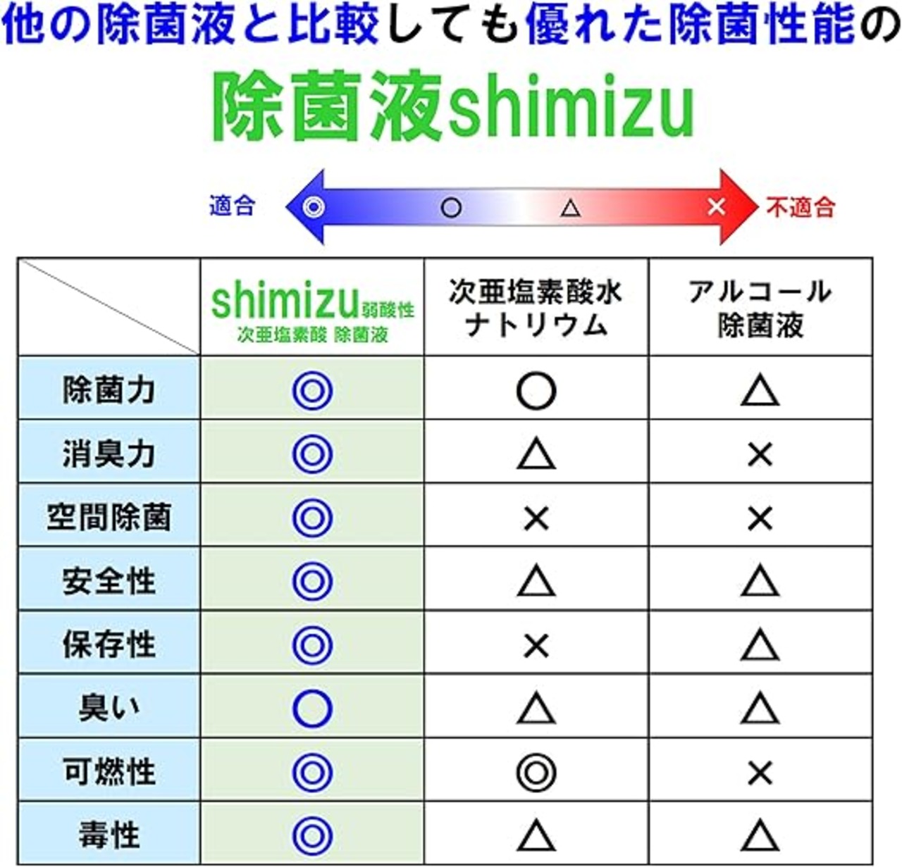 【安全性】shimizu除菌液は弱酸性の為、手に触れても手荒れ等の心配は無用です。除菌反応と共に水に変化するため、身体への影響か一切ありません。主成分が水の為、アルコール系の引火の危険性は無いため安全に扱えます。