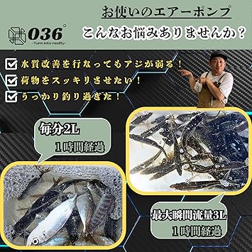4つの運転モード:強、中、弱、間欠モード 連続稼働時間:強 約16時間、中 約18時間、弱 26時間、間欠 約37時間 送風量:強 毎分約3L、中 、毎分約2.2L、弱 毎分約1.2L、間欠 本体サイズ:幅60mm×高さ95mm×奥行32mm 本体重量160g 多用途: 釣りや水槽、水耕栽培の酸素供給に最適で、様々な用途で活躍します。