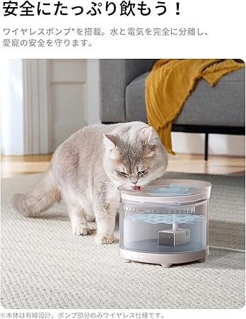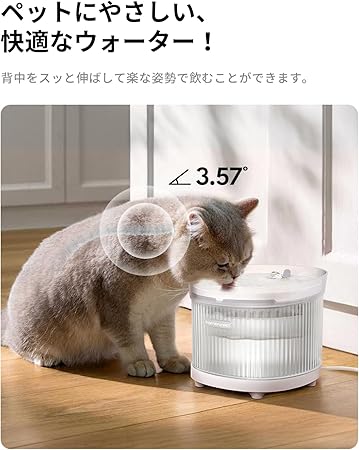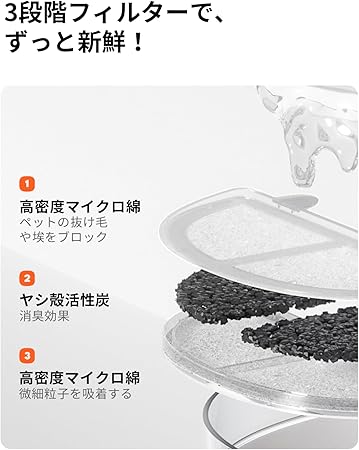 安全で快適な飲水体験:ワイヤレスポンプを採用し、電磁誘導による給電で漏電の心配がありません。フィルターは椰子殻活性炭を高密度マイクロ綿で挟んだ三層構造で、毛髪、ホコリ、微粒子を効果的に除去し、ニオイもスッキリ吸着して、いつでもキレイな水をキープします。さらに、トレイは飲みやすい3.57°の傾斜