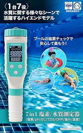 FieldNew 【国内ブランド】 7 in 1 残留塩素/水質測定器 (塩素/PH/EC/TDS/塩分/ORP/温度) 国内品質検査済 保証書付 防水 高精度 自動校正 動画解説 日本語マニュアル 校正液付 FAC 遊離残留塩素 プール a | Pettopoint