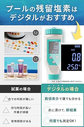 【塩素の安心検査】《注意》プールや消毒液専用です。うすい溶液や水道水の残留塩素は測定できません。遊離残留塩素を測定できるからプールの消毒効果のチェックが水に浸けるだけで簡単にできます。試験紙の場合は紙の色で見分けることが難しく、使用期限があるため使い切りになります。一方、本測定器ではデジタルで値が表示され何度でも測定できます。さらに、使用期限がないため次の夏にも使用することができるためおすすです。
