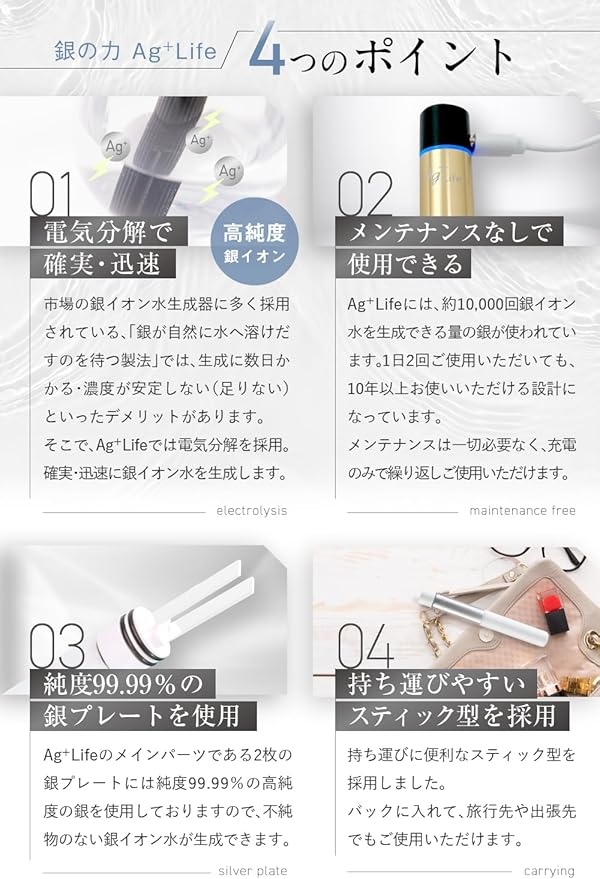 【たった10秒で水道水を除菌水に】Ag+Life(エージーライフ)は、水道水から除菌水(銀イオン水)を生成する画期的な製品です。本製品を水に浸して10秒待つだけで、銀イオン水ができあがります。