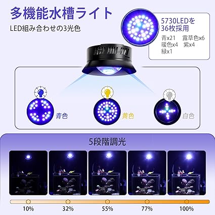 【タイマー・照明機能】(1)3タイマーモード:海水用水槽ライトは内蔵タイマーで照明時間を6時間、9時間、または12時間設定できます。(2)3光色モード:青色、暖色、白色。(3)5段階の明るさ調節