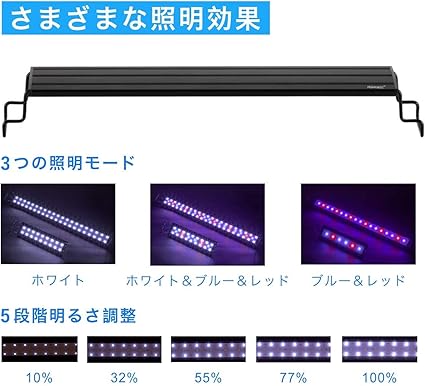 【明るさ調整可能】水槽用照明ライトはホワイト・ブルー・レッドの3種類の色の32個LEDビーズがある、3つの照明モードの変更で、魚、水草、水の究極の美しさを実現できます!また、5段階で光の明るさを調整できます。さ