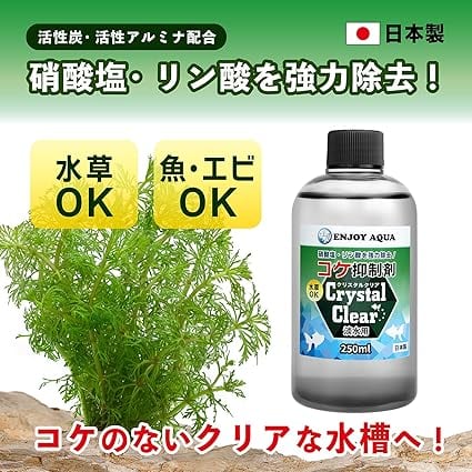 特殊な活性炭の粉末が入っており、硝酸塩を吸収し、コケの栄養素を減らすことでコケの発生を抑制します。 活性アルミナの働きで水中のリン酸を吸着除去し、コケのないクリアな水槽を維持します。