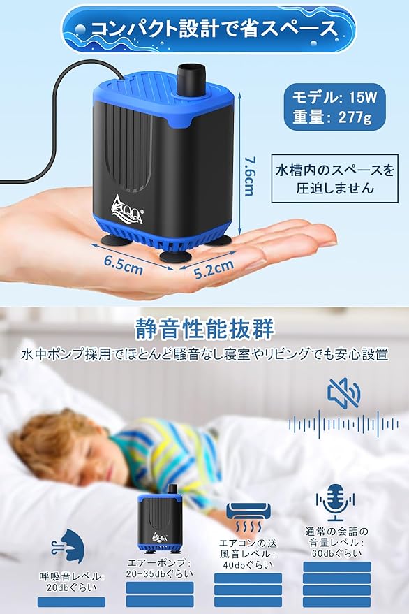 AQQA 水中ポンプ 小型ポンプ コントローラー操作可能 排水ポンプ 4段階流量調節 給餌モード機能 吐出量900L/H 最大揚程1.2M 静音 IP68防水 循環ポンプ 給水ポンプ 水槽用ポンプ 電動水ポンプ 水族館給水 水槽水循環 水耕栽培 噴水 (ブルー, 15W) a | Pettopoint
