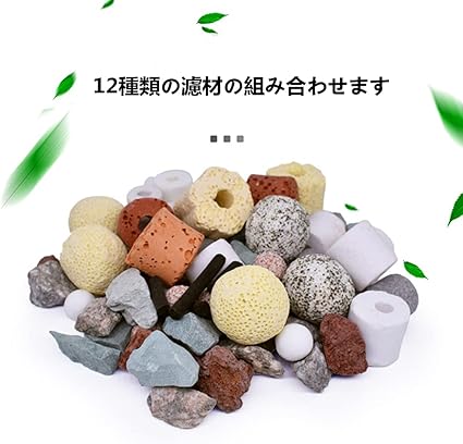 【12種類濾材】火山岩、麦飯石、ゼオライト、珊瑚砂、バイオセラミックリング、セラミックバイオボール、活性炭、ナノメートルバクテリアリングなど、12種類の濾材の組み合わせます。