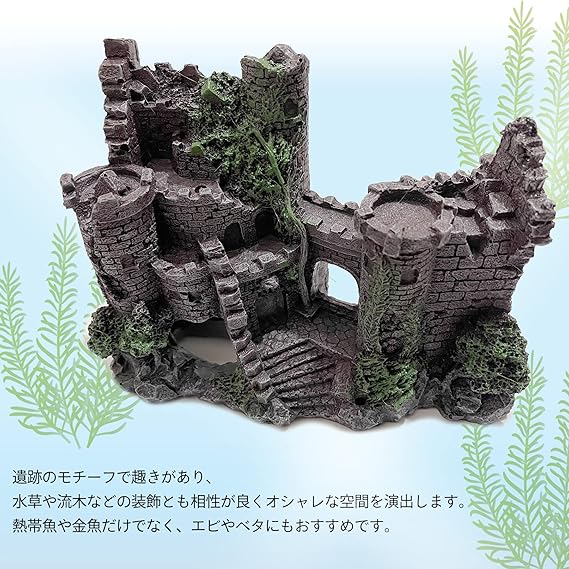 古城水槽オブジェは、アクアリウム内に遺跡の雰囲気を再現できる美しいデザインが特徴です。水草や流木との調和が取れており、自然な水中景観を演出することができます。リアルな造形がアクアリウムの鑑賞価値を高め、幻想的な水槽空間を作り出します。