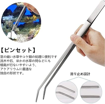 【カーブピンセット】:流木や石、ほかの水草の間などにも植栽が行ないやすいよう、アクアリウムに最適な独自の形状です。先端もきっちり合わさり、茎の細い水草やコケ類の処理に便利です。