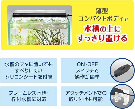 コンパクトで明るいスリム高輝度LED。厚さ8mm超コンパクトスリムボディ。水景を鮮やかに照らす自然の明るさで魚や水草を美しく魅せる。明るさ130lm、色温度6,800K、演色性Ra83。置き方自由自在!専用フタ「アクアカバー」(別売)でフラットにセット。水槽のフタに置いてもすべりにくいシリコンシート付で、フレームレス水槽にすっきり置ける。フレームレス水槽・枠付水槽に対応。コンパクト水槽用、幅40cm以下の水槽に最適。ON・OFFスイッチで操作が簡単。アタッチメントでの取り付けも可能。USB電源を