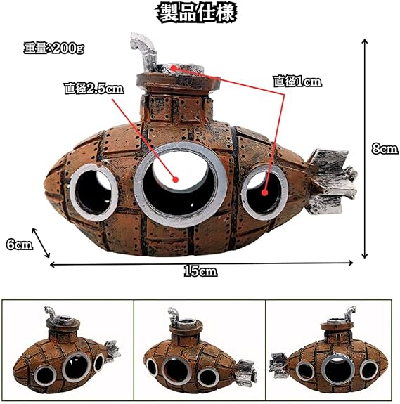 【リアル感漂うおしゃれなオーナメント】可愛らしい潜水艦をモチーフにした、アンティーク調のアクアリウムオーナメントです。独自の塗装技術により、本物のようなリアルな質感と色合いを再現しております。おしゃれで味のある、素敵な水槽レイアウトの演出に最適です。