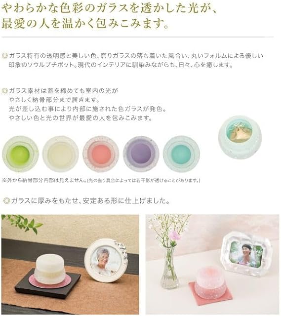 ソウルプチポットは、大切な方のご遺骨や遺灰、形見の品を、想いと共に納めることのできる器。手元供養のトップブランドであるSoulJewelry(ソウルジュエリー)だから実現できる、様々なライフスタイルやインテリアにマッチするミニ骨壺です。「ソウルプチポット 彩(さい)」は、ガラス製のミニ骨壺。落ち着いた透明感と丸みを帯びたフォルムの優しさ。現代のインテリアに馴染みながら、日々心を癒します。磨りガラスのため中に納めた物は透けず、差し込む光だけがやさしく納骨部分まで届きます。ガラスに厚みをもたせ、安定