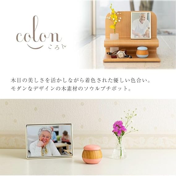 「ソウルプチポット ころん」は、木製のミニ骨壷。掌に包み込める小さな形は、膨らんだ木の実のよう。硬く丈夫な国産のケヤキが持つ天然素材の温もりと、淡く鮮やかな色合いが調和して、大切な想いを包み込みます。