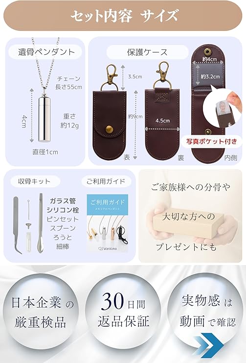 [alettimo] 遺骨 キーホルダー ペンダント 【写真ポケット付き保護ケース】 ガラス管二重防水 金属アレルギー対応 収骨キット付属 手元供養 遺骨入れ