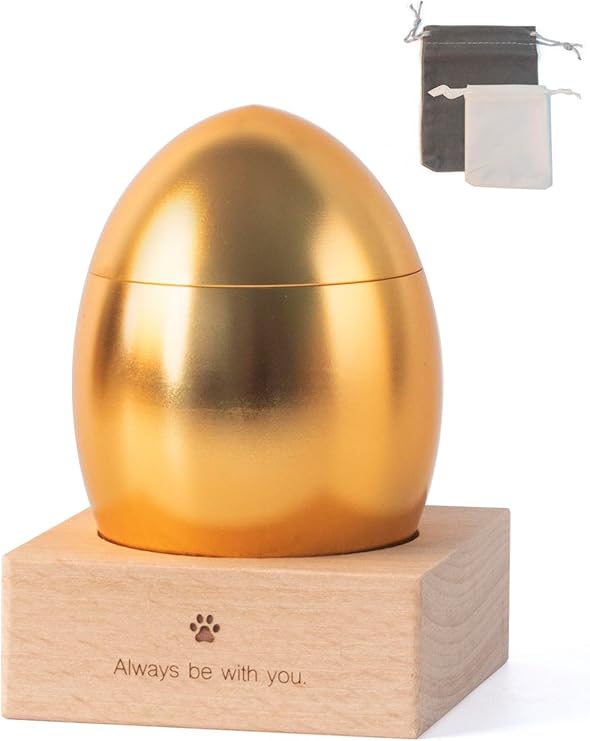 【ミニ骨壷】手のひらに収まる小さいペットちゃんの分骨壺です。見ているだけで心癒される可愛いたまご型。可愛い肉球プリント入り。丈夫な金属製の本体と、木製ベース、携帯ポーチが一緒になったミニ骨壷です。小骨壺のサイズは約 直径5.2×高さ約7.7mm ご遺骨を入れる開口部約4.3cm