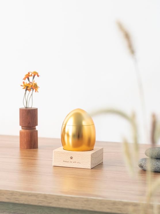 【デザインコンセプト】 たまごのモチーフには「再生、復活、誕生」という意味がこめられています。艶やかな光沢とまん丸のかわいいフォルムには、抱きしめたい優しさがあります。金属でできたミニ骨壷を手のひらで包めば、少しづつ手の