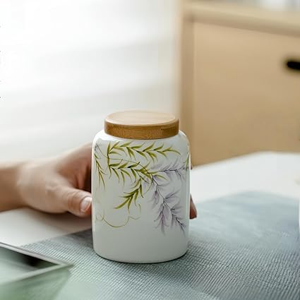 高品質陶器製: 白磁の表面に緑と紫の優美な葉模様が描かれた、手作りの骨壺です