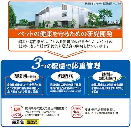 原材料:穀類(小麦粉、コーングルテンフィード、小麦ふすま、コーングルテンミール)、豆類(脱脂大豆、おから)、セルロース、油脂類(動物性油脂)、肉類(チキンレバーパウダー、ミートミール、チキンミール)、糖類(フラクトオリゴ糖)、セレン酵母、シャンピニオンエキス、ビタミン類(A、D3、E、K3、B1、B2、パントテン酸、ナイアシン、B6、葉酸、ビオチン、B12、C、コリン)、ミネラル類(カルシウム、ナトリウム、塩素、鉄、コバルト、銅、マンガン、亜鉛アミノ酸複合体、亜鉛、ヨウ素)、酸化防