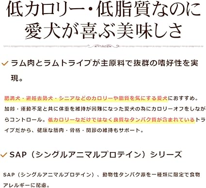 知る人ぞ知るグリーントライプ。 反芻動物の胃で、消化酵素やアミノ酸などの栄養が豊富に含まれる犬にとって至高の食べ物です。 そのトライプを臭くない、かつ食いつきが良く栄養満点のドライフードにしました。 肥満犬・避妊去勢犬・シニア犬などのカロリーや脂質を気にする愛犬にオススメです。