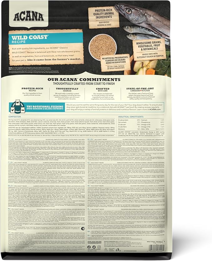 粗たんぱく質 27%, 粗脂肪 16%, 粗灰分 7.5%, 粗繊維 5%, 水分 12%, カルシウム/リン 1.2%/ 0.9%, オメガ6/オメガ3 2.6%/ 1.1%, DHA/EPA 0.4%/ 0.3%, 代謝エネルギー3443kcal/kg