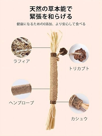 天然素材: 上質な猫のための木天蓼、木材、ジュートロープで作られたこの咬み棒は、あなたの愛猫にとって安全で健康です。