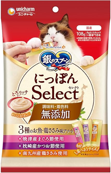 【無添加】[調味料・着色料不使用] 銀のスプーン にっぽんSelect とろリッチ 3種のお魚・鶏ささみ味アソート 108g [猫用おやつ]【国産/健康ケア/食べきりサイズ】 | Pettopoint