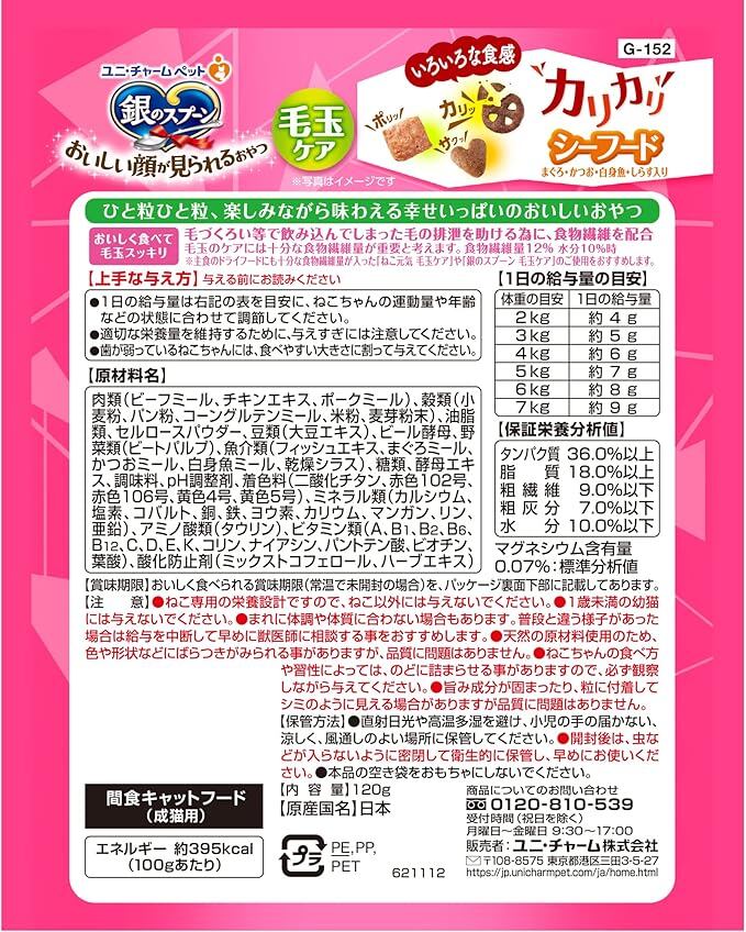 【まとめ買い】銀のスプーン 猫用 おやつ おいしい顔が見られるおやつ 毛玉ケア カリカリシーフード 120g×3袋 国産 キャットフード ユニチャーム