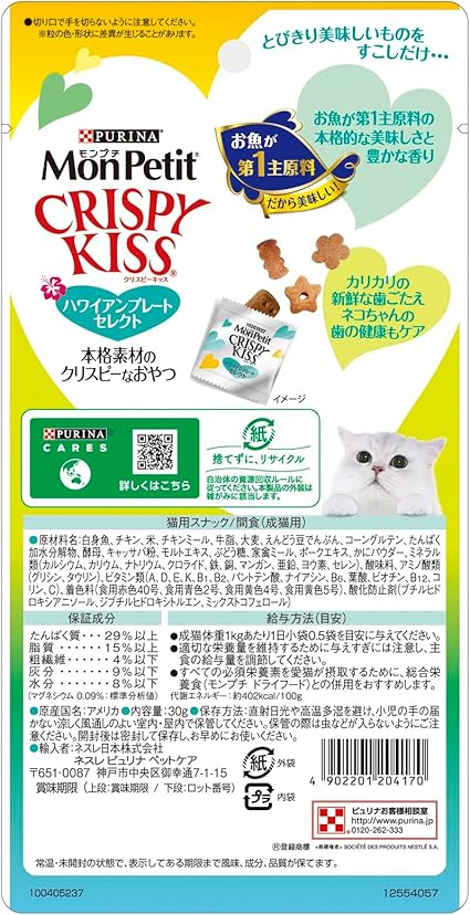 白身魚、チキン、米、チキンミール、牛脂、大麦、えんどう豆でんぷん、コーングルテン、たんぱく加水分解物、酵母、キャッサバ粉、モルトエキス、ぶどう糖、家禽ミール、ポークエキス、かにパウダー、ミネラル類(カルシウム、カリウム、ナトリウム、クロライド、鉄、銅、マンガン、亜鉛、ヨウ素、セレン)、酸味料、アミノ酸類(グリシン、タウリン)、ビタミン類(A、D、E、K、B1、B2、パントテン酸、ナイアシン、B6、葉酸、ビオチン、B12、コリン、C)、着色料(食用赤色40号、食用青色2号、食用黄色4号、食用黄色5