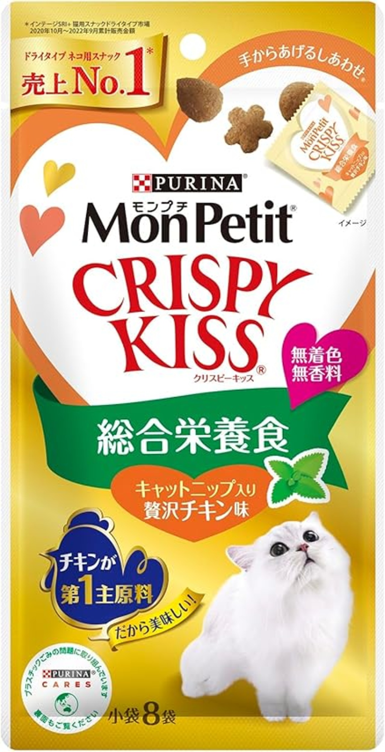 人気のモンプチ クリスピーキッスからネコちゃんに必要な栄養をバランスよく配合した総合栄養食登場。チキンが第一主原料でネコちゃんが夢中になる美味しさ。キャットニップ配合。美味しくかんでストレスケアにも。無着色無香料。