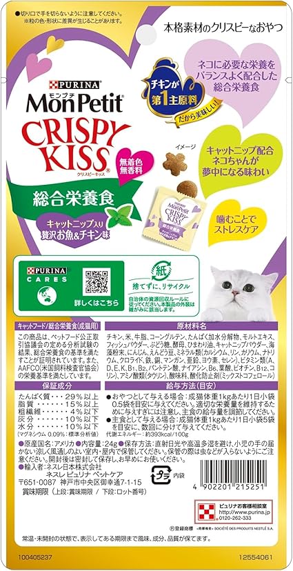 人気のモンプチ クリスピーキッスからネコちゃんに必要な栄養をバランスよく配合した総合栄養食登場。チキンが第一主原料でネコちゃんが夢中になる美味しさ。キャットニップ配合。美味しくかんでストレスケアにも。無着色無香料。