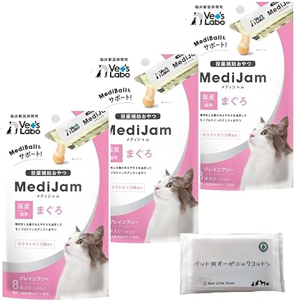 メディジャム 猫 薬 飲ませる おやつ 投薬 投薬補助 まぐろ 8本入り × 3袋 + SLS限定ペット用オーガニックコットン メディボール mediball Vet's Labo | Pettopoint