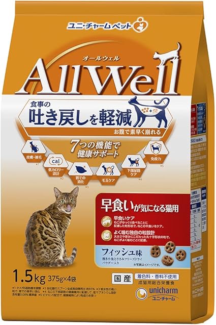 約7割のネコちゃんが経験している食事の吐き戻し(※)軽減を中心とした7つの機能で健康サポート。※ユニ・チャーム調べ