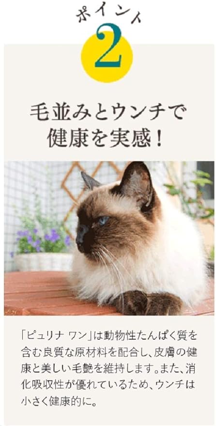 原材料:フィッシュ(サーモン、ツナ)、チキンミール、コーングルテン、小麦、米、脱脂大豆、大麦、鶏脂(オメガ6脂肪酸源)、フィッシュミール、とうもろこし、小麦たんぱく、たんぱく加水分解物、可溶性繊維、魚油(オメガ3脂肪酸源)、酵母(βグルカン源)、 ミネ