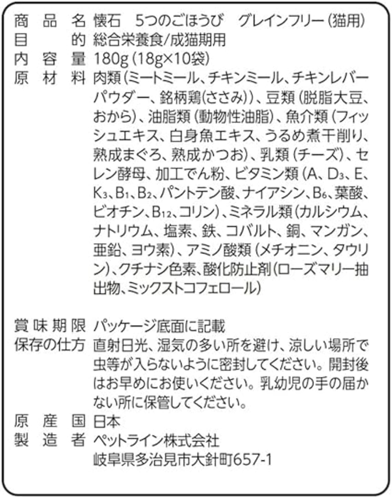 ペットライン 懐石 5つのごほうび グレインフリー キャットドライ グルメ【 国産/小分け/トッピング】 180g