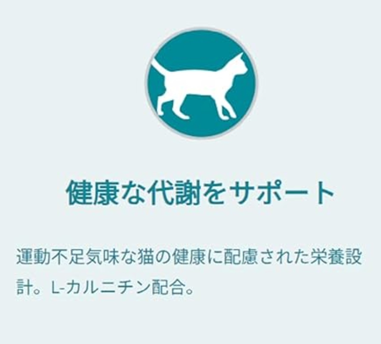 ●Lーカルニチン配合で健康な代謝をサポート ●太り気味の猫のダイエットをサポート。高食物繊維設計で満腹感を維持。 ●脂肪とカロリーを減らしたフードの設計で代謝エネルギーをコントロールして体重管理。