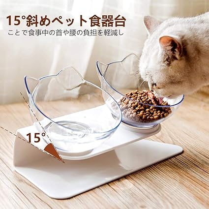 【猫工学設計】15°斜めペット猫 えさ 皿なので、猫の負担を軽減できる。、猫ちゃんがより快適にお食事できます。また、猫 食器デザインで、どんな顔型のネコちゃんにもフィットします。ボウル2個付きで、フードとお水、もしくは2匹分のフードを並べて与えることができます。中身が透明で食べたのかどうか遠くからでも一目見たら分かるし飼い主も猫ちゃんも楽です。