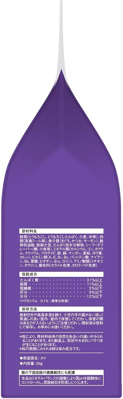 原材料:穀類(とうもろこし、とうもろこしたんぱく、小麦、米等)、肉類(家禽ミール等)、魚介類(まぐろ、かつお、サーモン)、動物性油脂、脱脂大豆、たんぱく加水分解物、シーフードフレーバー(鯛、小魚等)、ミネラル類(カルシウム、リン、