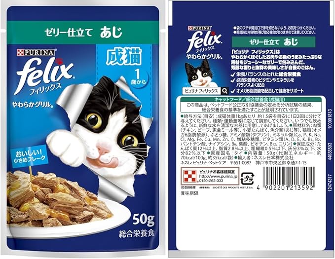 原材料1:【成猫用 ゼリー仕立て ツナ】肉類(チキン、ビーフ、家禽ミール 等)、小麦たんぱく、魚介類(ツナ 等)、鶏脂(オメガ6脂肪酸源)、ぶどう糖、アミノ酸類(タウリン)、ミネラル類(Ca、P、K、Na、Cl、Mg、Fe、Cu、Mn、Zn、I)、増粘多糖類、ビタミン類(A、D、E